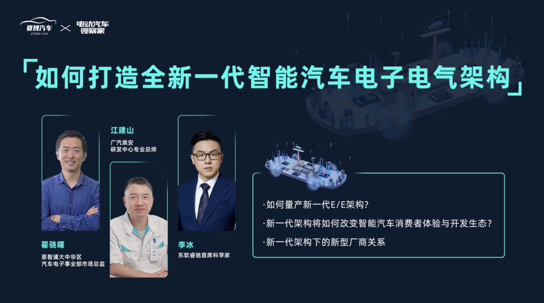 近日,东软睿驰首席科学家李冰、广汽埃安研发中心专业总师江建山、恩智浦大中华区汽车电子事业部市场总监翟骁曙一同受邀参加《赛博汽车》&《电动汽车观察家》 “如何打造全新一代智能汽车电子电气架构”主题研讨会,三位专家对E/E架构的域融合趋势演进、从概念到量产中OEM与软硬件供应商遇到的挑战及落地过程实践经验进行分享交流。
