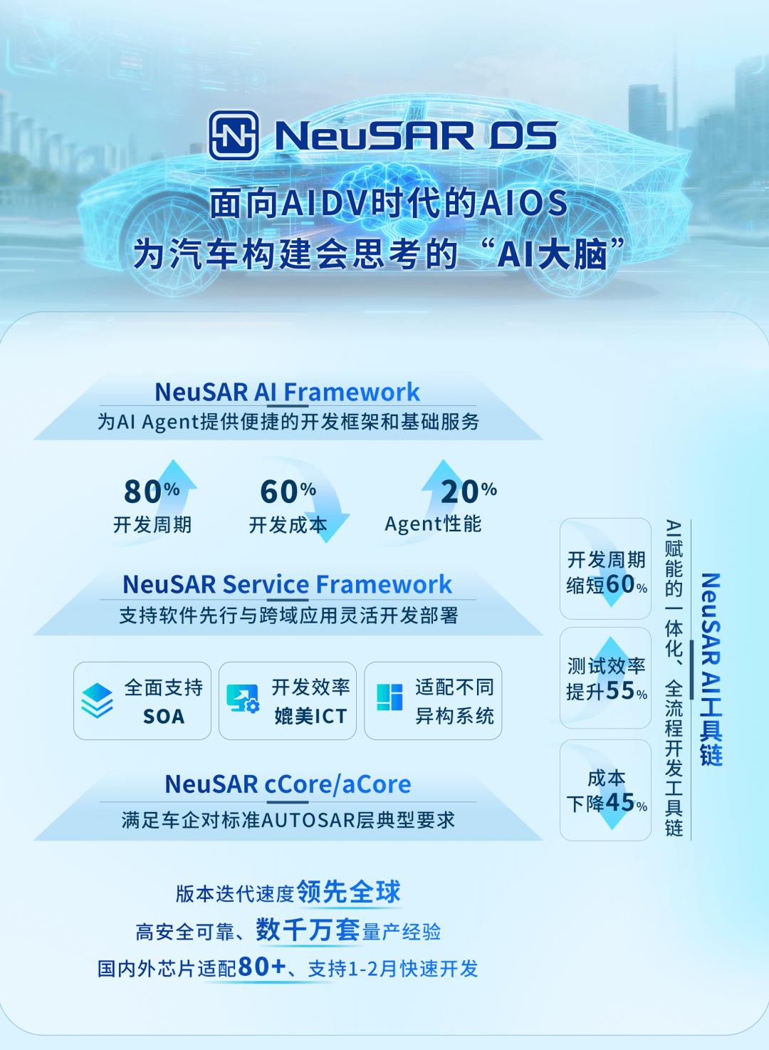在AIDV趋势加速落地的关键时期,东软睿驰率先推出了面向AIDV时代的AIOS——NeuSAR OS,通过开放、可扩展的架构设计,在系统层面提供专门针对车内AI应用开发、部署及迭代的平台能力支撑,助力车企高效构建具备持续进化能力的智能汽车软件平台化底座,同时提供AI赋能的工具链,从智能编码到自动测试,让汽车软件研发效能与智能汽车的进化速度同频,质量效率双升,成本风险双降。