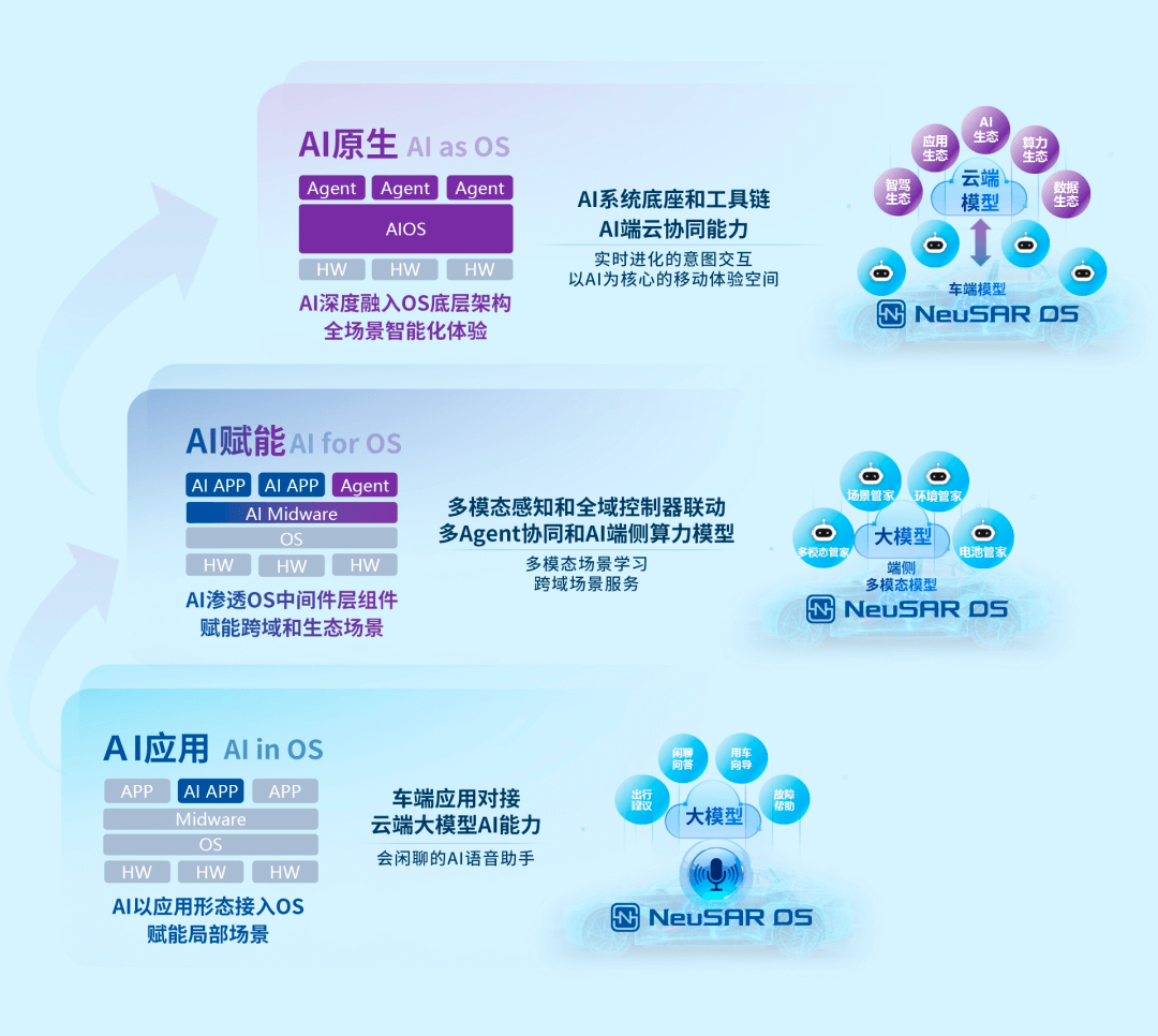 在此背景下,AI 能力需要由外而内地融入汽车操作系统架构中,从“AI in OS——AI以应用形态接入OS,赋能局部场景”到“AI for OS——AI渗透OS中间件层组件,赋能跨域和生态场景”,最终迈向“AI as OS——AI深度融入OS底层架构,支撑全场景智能化体验”的原生形态,真正实现汽车智能化场景体验的全面升级。