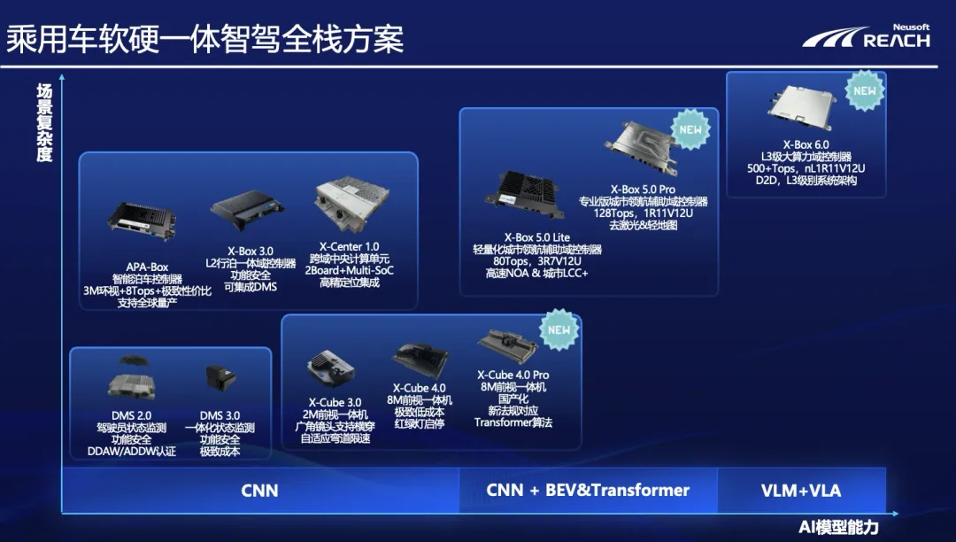 在乘用车领域,睿驰推出了满足不同场景复杂度以及搭载不同AI模型能力的智能辅助驾驶产品,在基础感知领域,提供X-Cube系列前视一体机,满足全球法规与基础L2功能需求。面对行泊一体与高阶智能场景,X-Box系列域控制器提供从标准行泊一体到城市领航的全系列产品方案,其中X-Box 5.0域控制器以“轻地图、纯视觉”技术路径,实现城市车道级领航功能,同时最新推出基于500+TOPS算力平台、采用L3级别系统架构设计的X-Box 6.0,加速高阶辅助驾驶的应用落地。