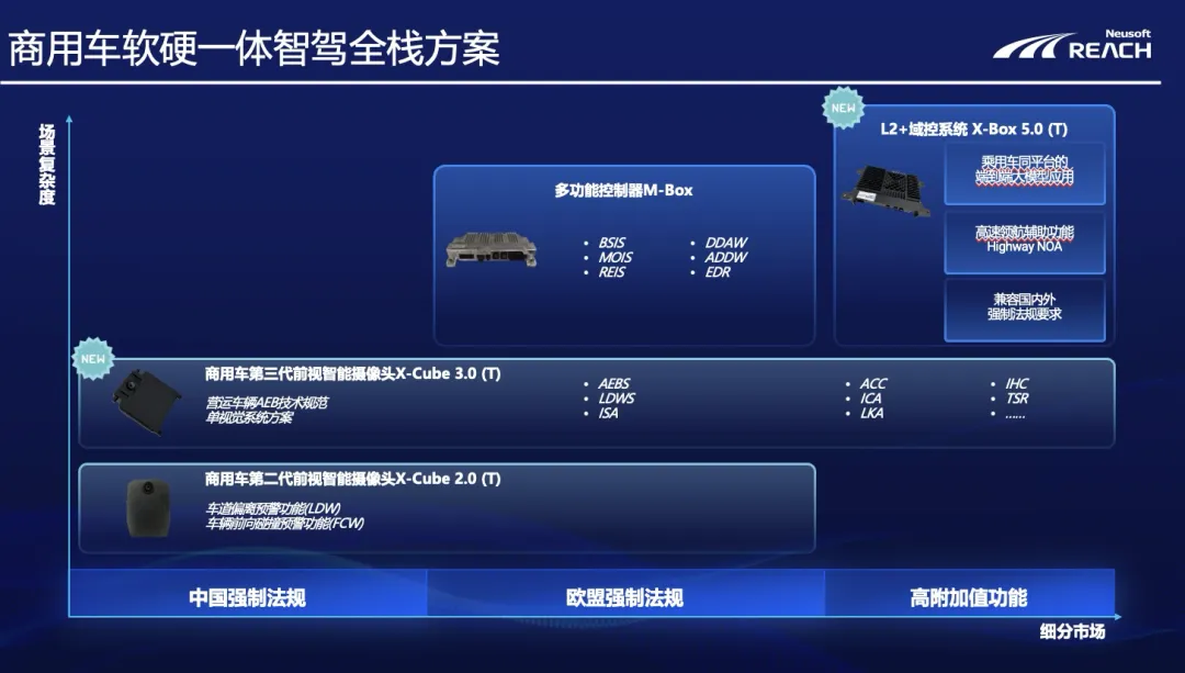 在商用车领域,睿驰紧密贴合法规合规与场景增效的双重需求,提供X-Cube系列前视一体机可灵活适配中国、欧盟等全球市场的强制安全法规;M-Box多功能控制器集成满足BSIS、DDAW等在内的多项法规功能,同时将经过乘用车量产验证的X-Box 5.0(T)高阶域控制器成功应用于商用车,在满足法规“安全底线”的同时,为商用车带来了高速领航辅助等增效功能,为商用车安全底线与舒适驾驶提供有力支撑。