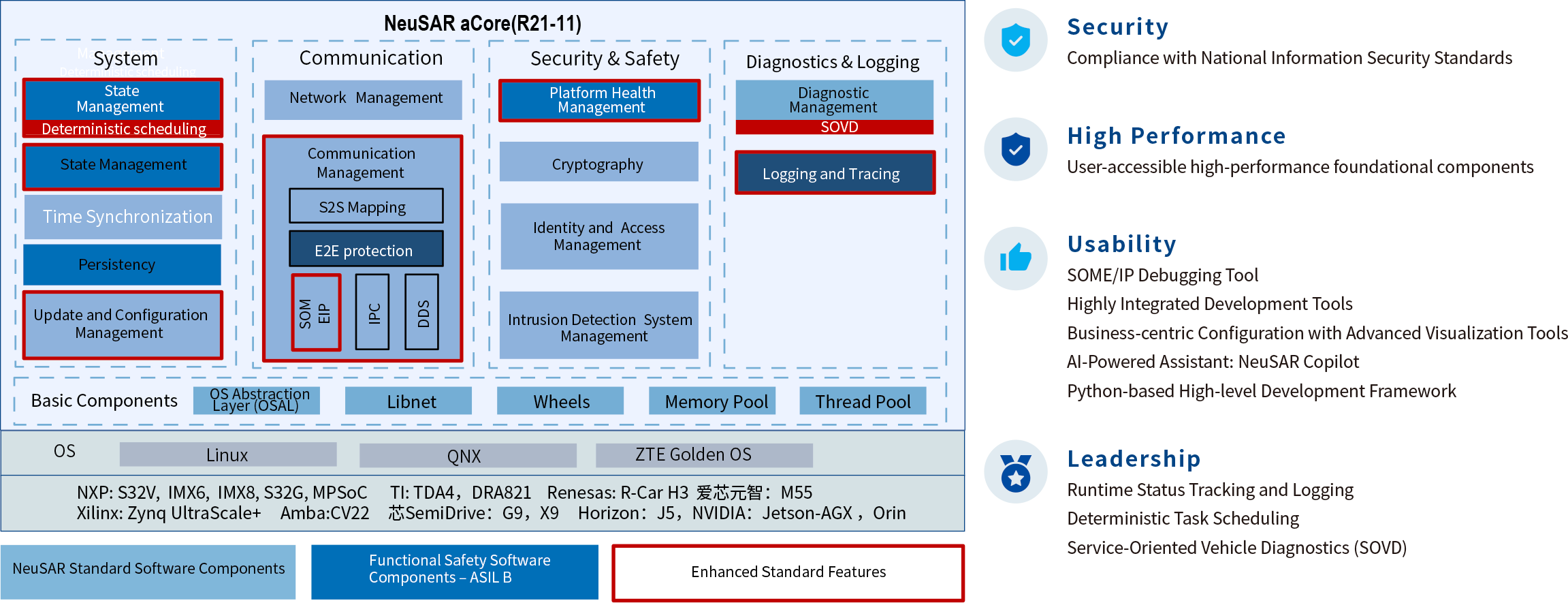 NeuSAR aCore 4.0 delivers a functionally safe, industry-compliant platform based on the AUTOSAR Adaptive R21-11 standard. With industry-leading update cycles, extensive mass production deployment experience, and exceptional platform stability, NeuSAR aCore 4.0 stands out as a reliable solution for next-generation automotive software development. It also offers strong localized technical support and is capable of customization to meet enterprise-specific standards.